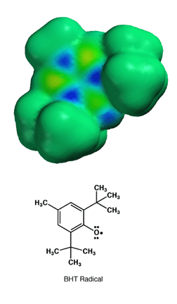 | Butylated hydroxytoluene (BHT) is a food additive known as a preservative. It prevents oxidation of molecules in food such as fatty acids. The key feature of BHT is that it forms a very stable radical on the oxygen atom. In fact, because of the benzene ring which allows for extensive resonance stabilization, this radical is extremely easy to form, and will form in preference to almost all other types of radicals.The color picture below to the right shows the BHT radical surface, colored to indicate the location of the unpaired electron density (called "spin"). The blue color indicates relatively high unpaired electron density. Notice how this is distributed to three places on the benzene ring as well as being on the oxygen atom. This distribution is stabilizing, explaining with BHT forms a radical forms so easily | |||||||||||||||||||