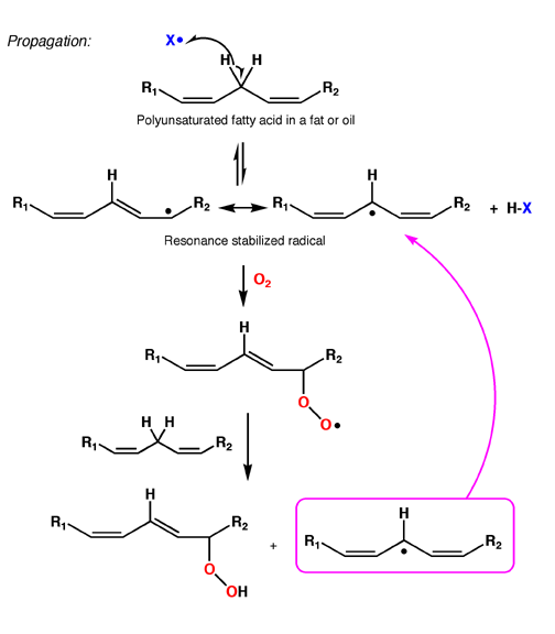 | Fats and oils with polyunsaturated fatty acids become rancid when left open to the air (access to O2) because of a radical chain reaction. First, a radical process is initiated in very low concentrations in the food. This can be from a small amount of a molecule prone to make radicals in the sample, such as peroxides. It does not take much of an initiation for a radical reaction to take place. The radical reacts with polyunsatured fatty acid chains to create a resonance stabilized radical intermediate. This reacts with oxygen (O2) to create a peroxyradical, that reacts with another fatty acid molecule to create the hydroperoxide derivative of the fatty acid and a new resonance stabilized fatty acid radical, which continues the chain reaction. Further, the hydroperoxide fatty acid produced might itself break the O-O bond to initiate further radical chain reactions. | |||||||||||||||||||