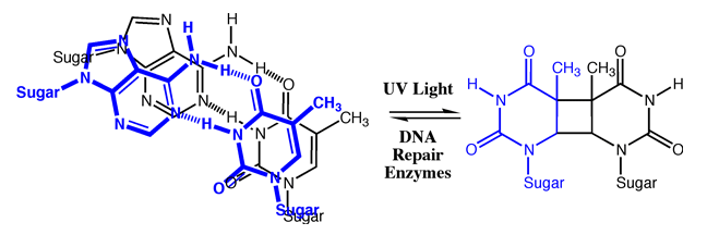 Heavy exposure of your skin to UV light causes many such thymine crosslinks to form in the DNA. Fortunately, we have repair enzymes that can remove the thymine crosslinks and restore the DNA in your skin cells back to the correct sequence.