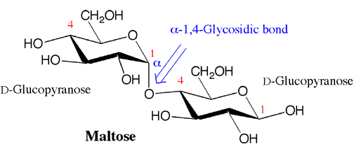 Specific enzymes can put carbohydrates together by making glycosidic bonds between the anomeric carbon of one carbohydrate and one of the -OH groups on another carbohydrate. The result is a molecule with two saccharides so they are called disaccharides. Note that the glycosidic bond can be alpha or beta, and that the second carbohydrate can be linked at any of the carbon atoms that contain an -OH. The glycosidic bond is named as alpha or beta, followed by numbers that correspond to the locations of the carbons involved in the glycosidic bond. Importantly, as described above, the glycosidic bond that is formed prevents alpha beta interconversion at the acetal carbon, so an alpha linkage remains an alpha linkage and a beta linkage remains a beta linkage. Many important carbohydrates in biochemistry are really disaccharides. For example, maltose, the form of sugar found in malted grain, is really a disaccharide with an alpha-1,4-gylcosidic bond between carbons 1 (the anomeric carbon) and 4 of two D-glucopyranose molecules (i.e.D-glucose in the cyclic form).