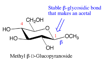 Carbohydrate monomers such as D-glucose, D-fructose or D-galactose are called monosaccharides. They are cyclic hemiacetals. Carbohydrates can be turned into cyclic acetals by reaction with an alcohol such as methanol in acid. The reaction follows the same mechanism as regular acetal formation. The bond to the alcohol is given the special name of glycosidic bond. If it is made from the alpha anomer, it is called an apha-glycosidic bond. If it is made from the beta anomer it is called a beta glycosidic bond. Turning a monosaccharide into an acetal has an important consequence. The anomers do not interconvert without strong acid so the alpha anomer will stay alpha and the beta anomer will stay beta. Shown below is methyl beta-D-glucopyranose, the methyl acetal of glucose with a beta glycosidic bond. |