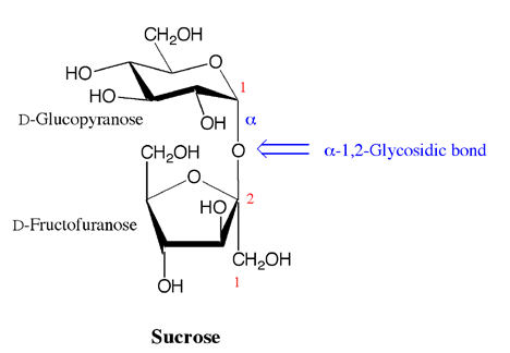 | Sucrose, table sugar, is not pure glucose, but rather a disaccharide with an alpha-1,2 glycosidic bond between carbon 1 of D-glucopyranose (D-glucose) and carbon 2 of D-fructofuranose (D-fructose). In an animal's body, the glycosidic bond of sucrose is broken, and the D-fructose is converted into D-glucose and used to supply a quick source of energy. Eating or drinking too much sucrose results in a quick release of a glucose, and individuals with diabetes do not have the ability to properly regulate glucose levels in their blood, so injesting a large amount of sucrose is a problem for them. | ||||||||||||||||||||||