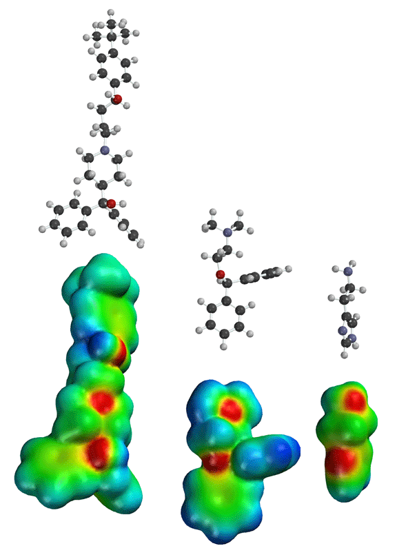 Seldane (terfendine) was designed to have the same pharmacophore as benadryl (circled in purple in the structures at the top of the page), but it was intentially designed to not cross the blood-brain barrier. This largely worked, and seldane was introduced as a next generation antihistamine that did not cause drowsiness. Unfortunately, a few people died of heart failure when they took seldane and seldane was quickly pulled from the market. How could this happen?? In the electrostatic potential surfaces below, note the pharmacophore, namely the two areas of high electron density (red color) that have the same location in three-dimensional space among all the molecules. |